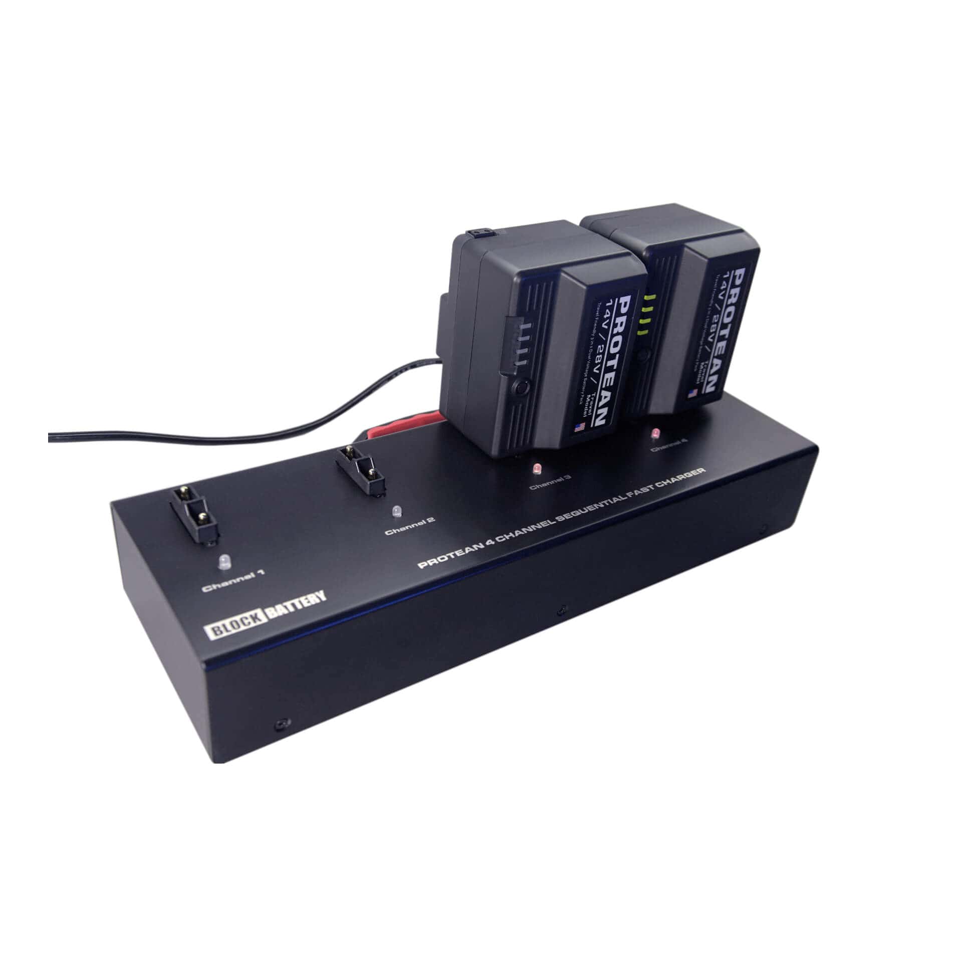 The Protean 4 Charger is a space saving 4 Channel Sequential Fast Charger. The Protean 4 can charge a Protean Battery from empty in 3 hours then will automatically sequence to the next battery for Charging, keeping the battery supply constantly refreshing as production requires. The Protean 4 charger will charge any Protean battery regardles of the battery configuration and mode, 14/28/ or Travel. Built to last, the Protean 4 is microprocessor controlled and constructed of a strong and durable aluminum housing with a convenient carrying handle.